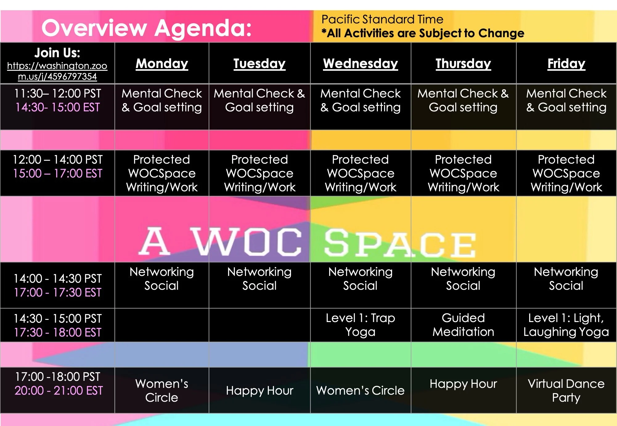 A virtual safe space for Women of Color (WOC) and Allies to simply exist. Join us daily on Zoom: 9am (PST) morning motivation, 12pm CoWOCing space, 5pm (PST) happy hour! Link address: https://t.co/unwY74Hz3D?amp=1